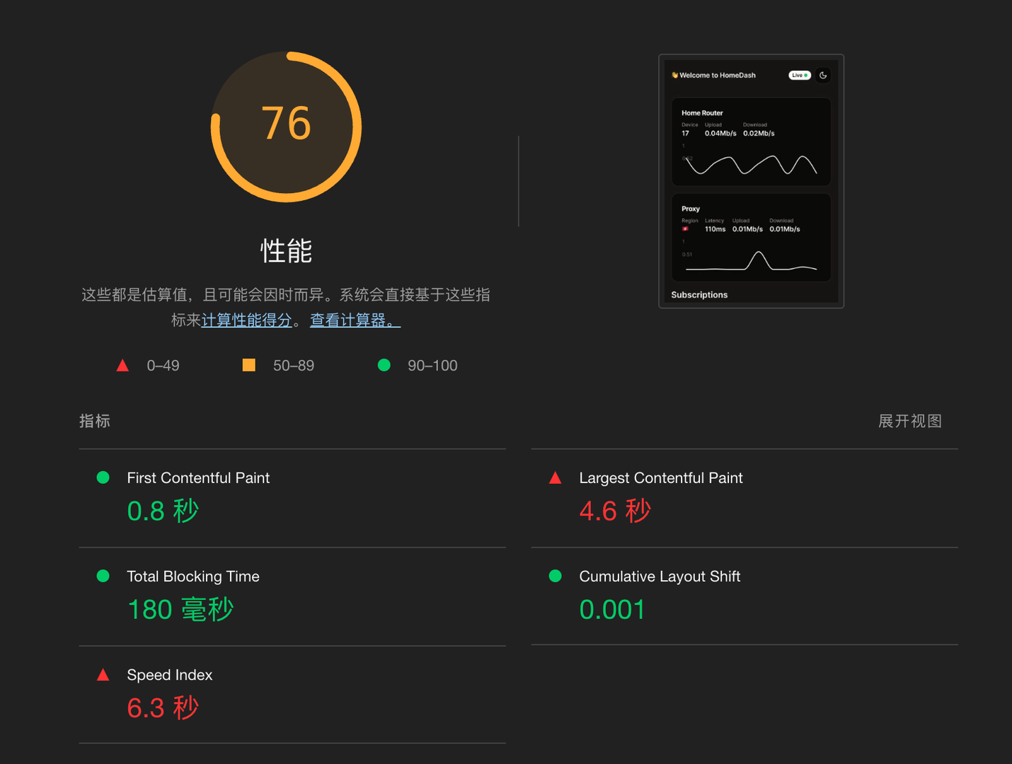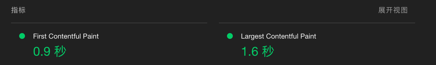 可以看到目前站点首屏的 Lighthouse 性能测试中,LCP(Largest Contentful Paint)Speed Index 两项指标的表现并不是很好。