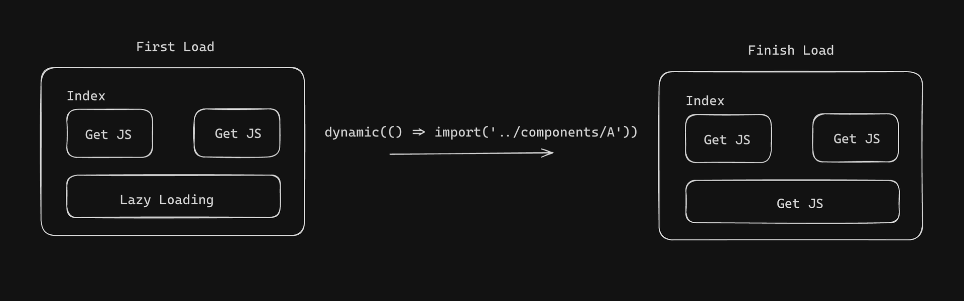 动态导入是其中的一种方式,原理十分简单,在初次获取页面时,并不会去获取需要动态导入的依赖包,只有在页面加载后,才会根据条件去进行获取依赖包,这对于大型网站的优化十分有用,比如需要用户点击后才会出现的图表,或者是需要登录后才会显示的一些用户组件,这些都是无需在第一次获取页面时就去下载的数据,因此都可以使用动态导入来进行优化。